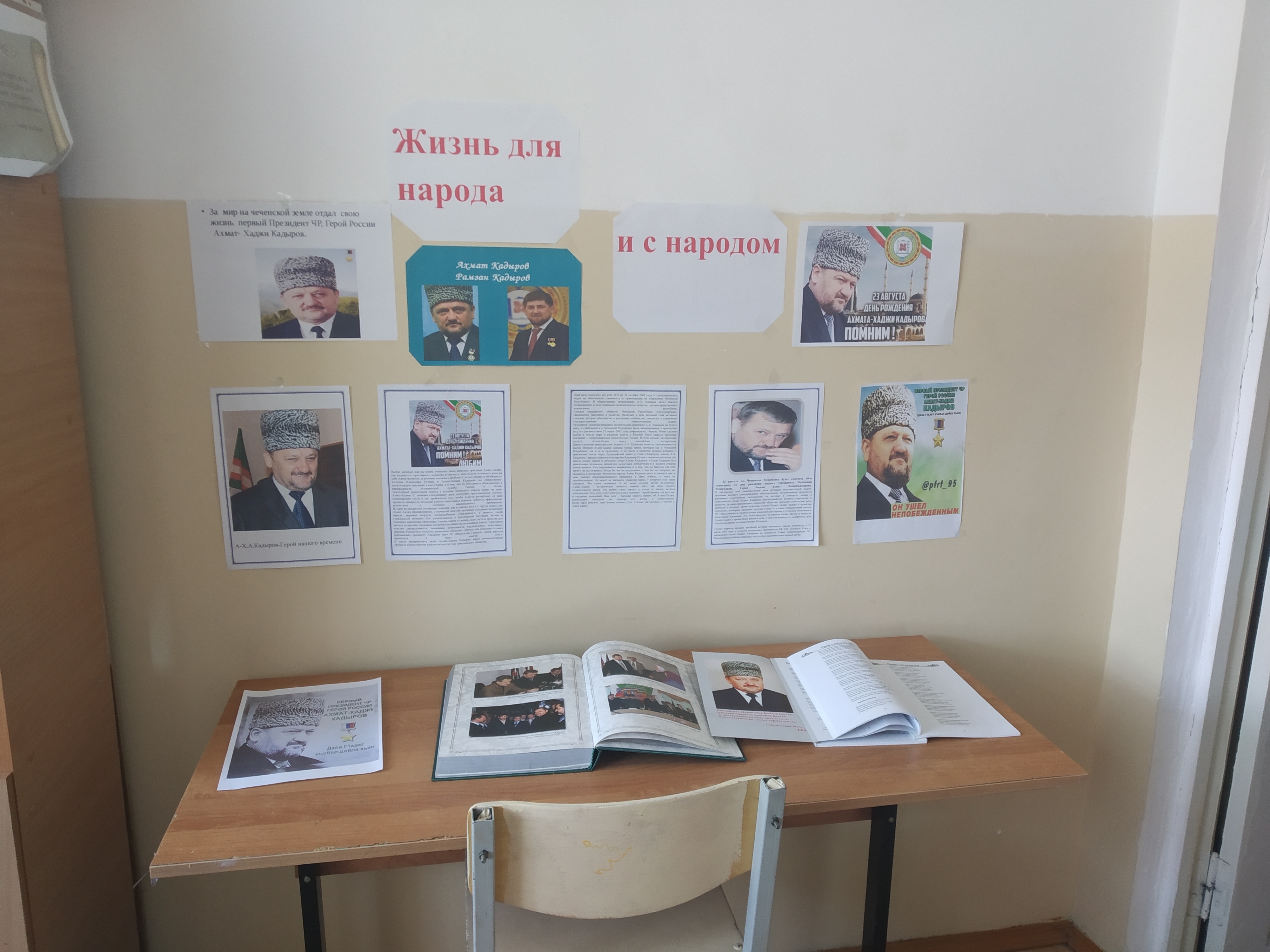 Сцелью проинформировать читателей о жизни первого Президента ЧР, Героя России А-Х.А. Кадырова, создать в них чувство гордости за таких великих людей, развить патриотизм и героизм в МБОУ «Червленно-Узловская СОШ» 10 августа 2019 года библиотекарем школы Абдулаева Э.М. былаорганизовала книжная выставка, посвященная 68-й годовщине со дня рождения Первого Президента ЧР, Героя России Амата-Хаджи Кадырова. На выставке были представлены все книги с фонда библиотеки, связанные с жизнеописанием президента, также его фотографии, фотографии его друзей.