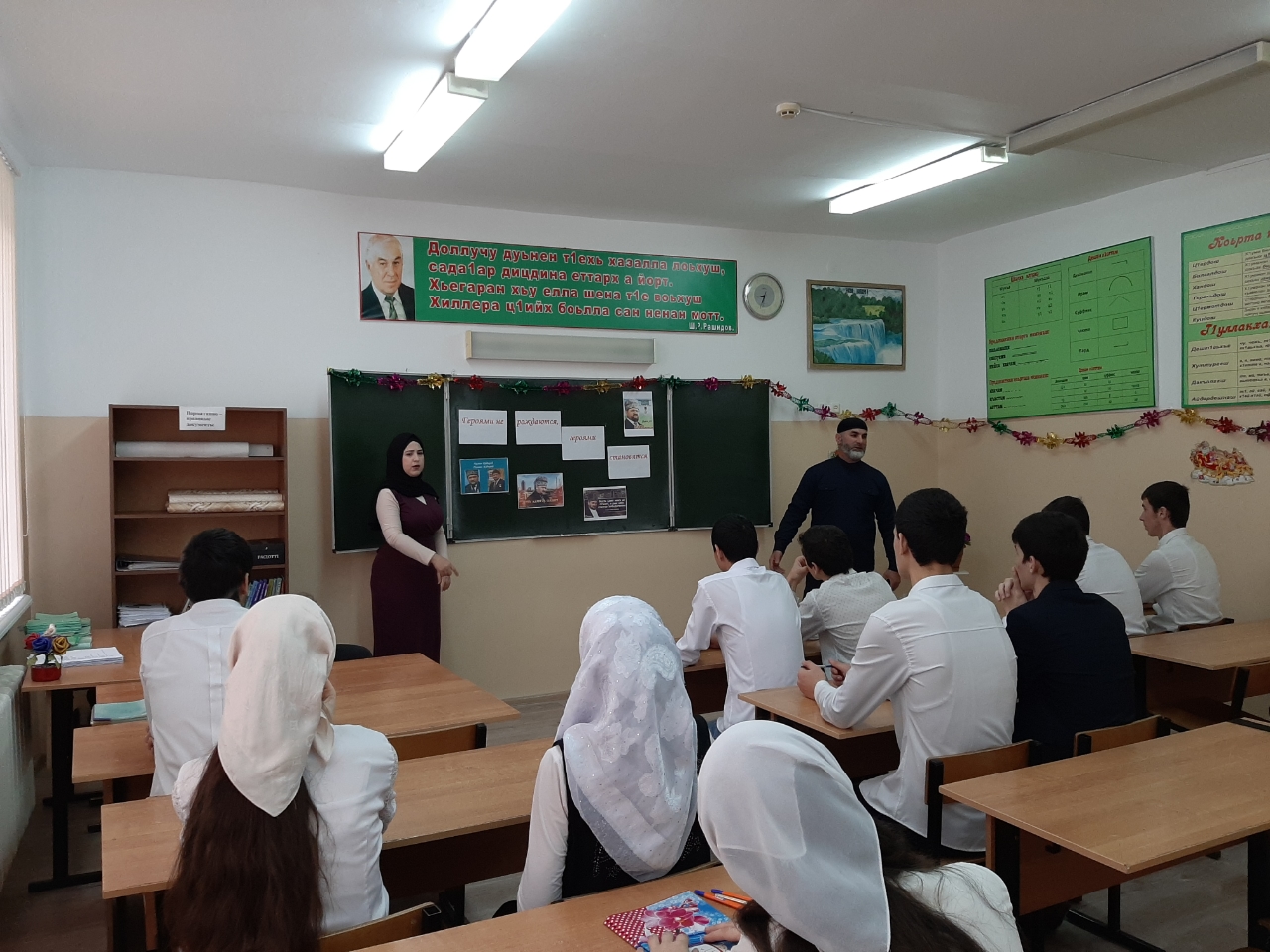 7 декабря классный руководитель 11 класса Абдулаева Э.М. и педагог ДНВР Тулаев Х.А. провели беседу с обучающимися 10-11 классов «Героями не рождаются, героями становятся». В ходе беседы обучающиеся пополнили свои знания о жизни и подвигах Первого Президента ЧР, Героя России А-Х.А.Кадырова.