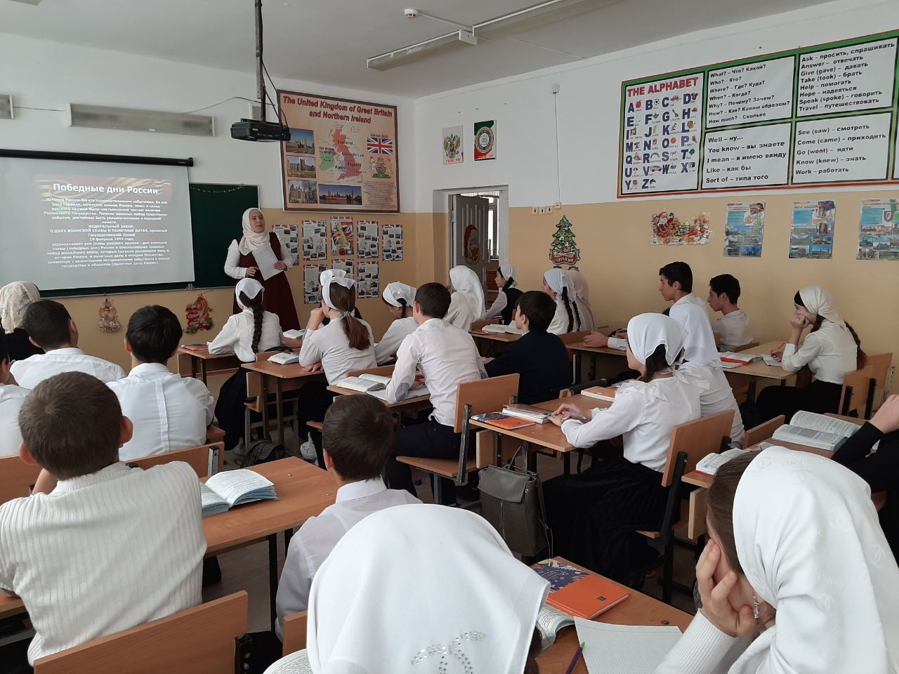 Классный руководитель 10 класса Баймурадова Л.М. провела урок мужества «Герои Чечни в ВОВ». На уроке Луиза Мусаевна рассказала о героях Чечни. Она рассказала, что в разные периоды времени, у нас было много героев : Хампаши Нурадилов; Мовлит Висаитов- герой ВОВ, о которых мы всегда должны помнить.