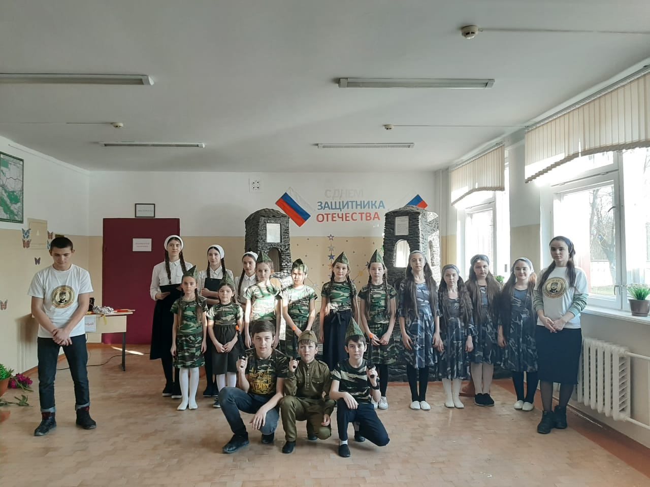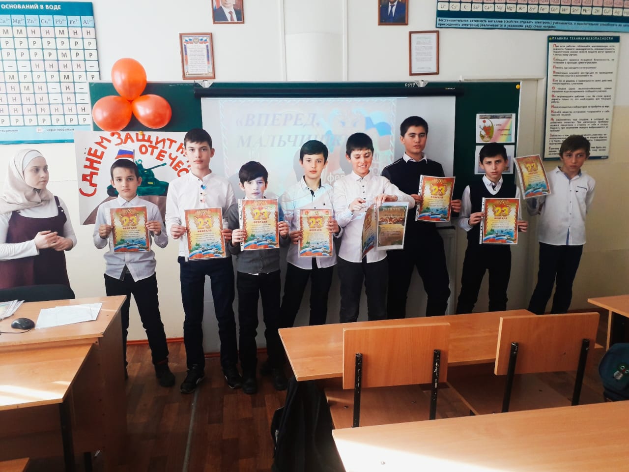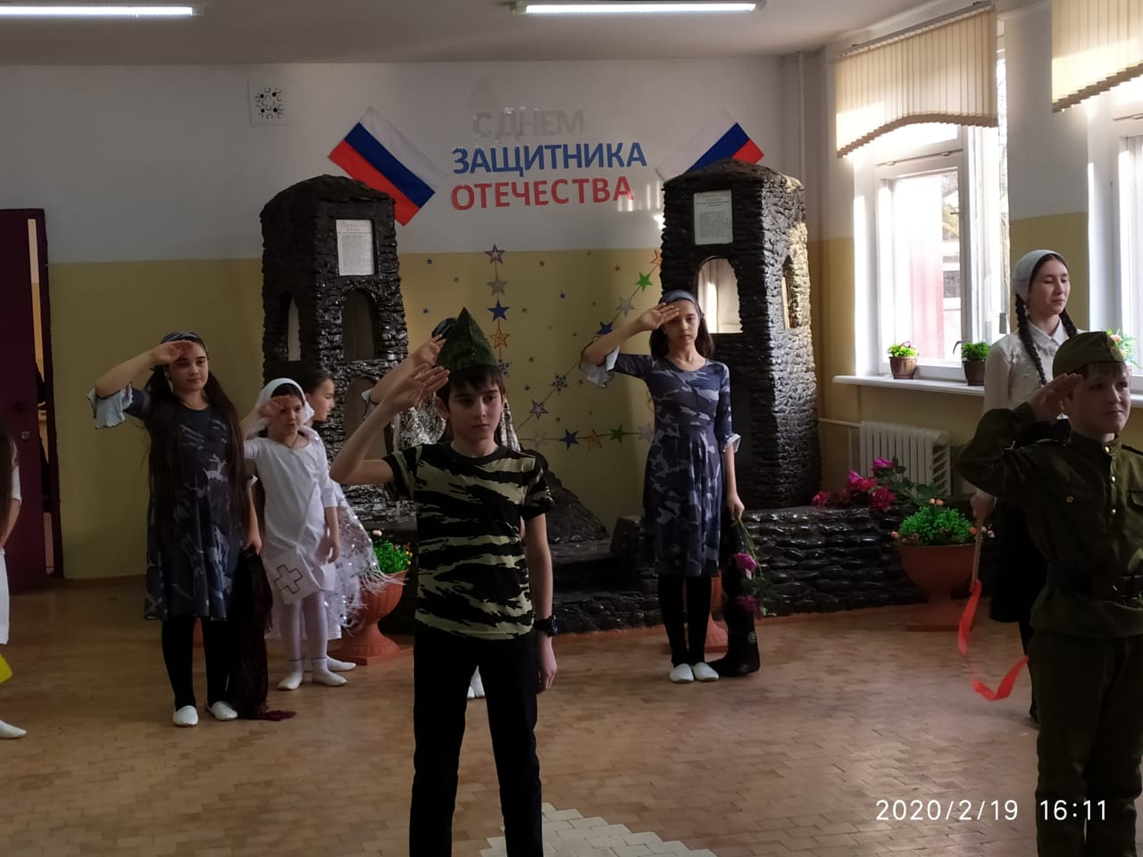 19 февраля в школе прошло общешкольное мероприятие , посвященное Дню защитника Отечества. Силами учащихся школы и членами ЧРОО ЕДЮО «Юные Кадыровцы» была подготовлена праздничная программа. Для сильной половины человечества прозвучали слова поздравления, стихи и песни от обучающихся школы.