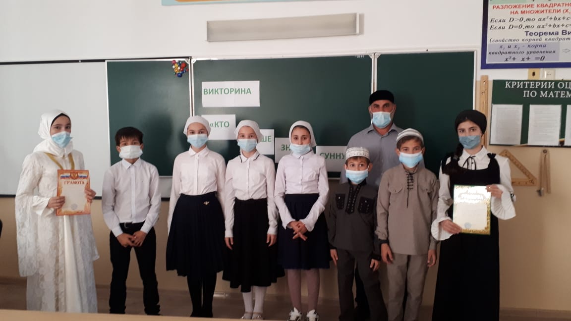 С целью ознакомления подрастающего поколения с основами Ислама и сунной Пророка Мухаммада (да благословит его Аллах и приветствует) 24.10.2020 г. в школе прошла познавательная викторина среди учащихся 5-11 классов на тему «Кто лучше знает сунну?». Задачей конкурса являлась выявление и поощрение учащихся, отличившихся в знании сунны Пророка Мухаммада (да благословит его Аллах и приветствует). Лучшие знания сунны показали ученицы 8 класса Ислямова Замира и Адуева Радима.
