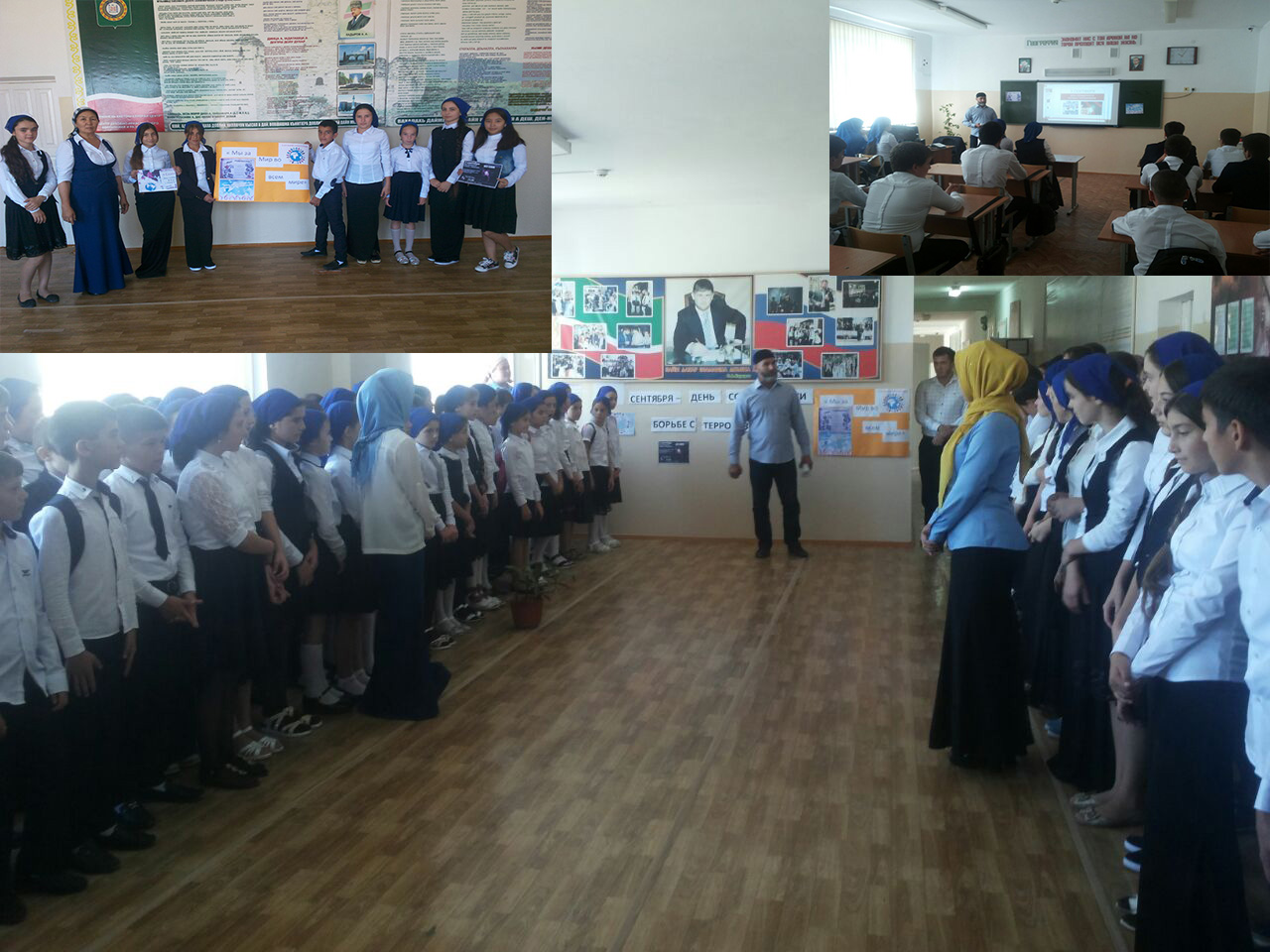 В 1-11 классах были проведены классные часы «Они хотели жить…», «3 сентября - День солидарности в борьбе с терроризмом» и др. На классных часах учителя информировали обучающихся о проблемах формирования межнациональной толерантности, дружбы и взаимопонимания, профилактике терроризма в многонациональной молодежной среде республики. Но главная мысль, которую хотели донести классные руководители – это необходимость каждому начать с самого себя, любить и уважать друг друга.