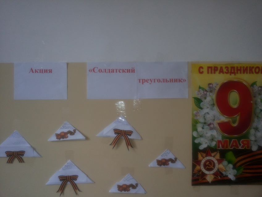 15.05.2015Цель акции – вспомнить всех, кто воевал в ВОВ, и собрать из солдатских треугольников-писем «Стену Памяти». В школе с 29 апреля по 5 мая были вывешены объявления о проведении акции, создавались письма – треугольники, был организован сбор информации об участниках Великой Отечественной войны, об этапах их фронтового пути. Приняли участие в данной акции учащиеся 5-11 классов- 46чел.